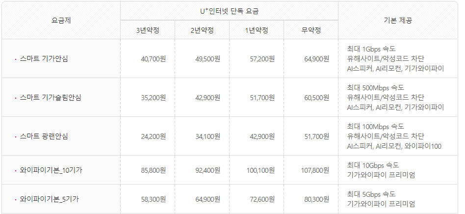 10GIGA인터넷 최대10G는 인터넷 슈퍼프리미엄 10GIGA인터넷 최대5G는 인터넷 프리미엄플러스 10GIGA인터넷 최대 25G는 인터넷프리미엄 기가인터넷최대 1G는 인터넷 에센스 기가인터넷500M는 인터넷베이직 인터넷 최대 200M는 인터넷 슬림플러스로. LTE데이터선택 요금제 이용 시 시즌 플레인을 무료 이용 가능합니다. 최신 GiGA WiFi 공유기 2대 기본제공.